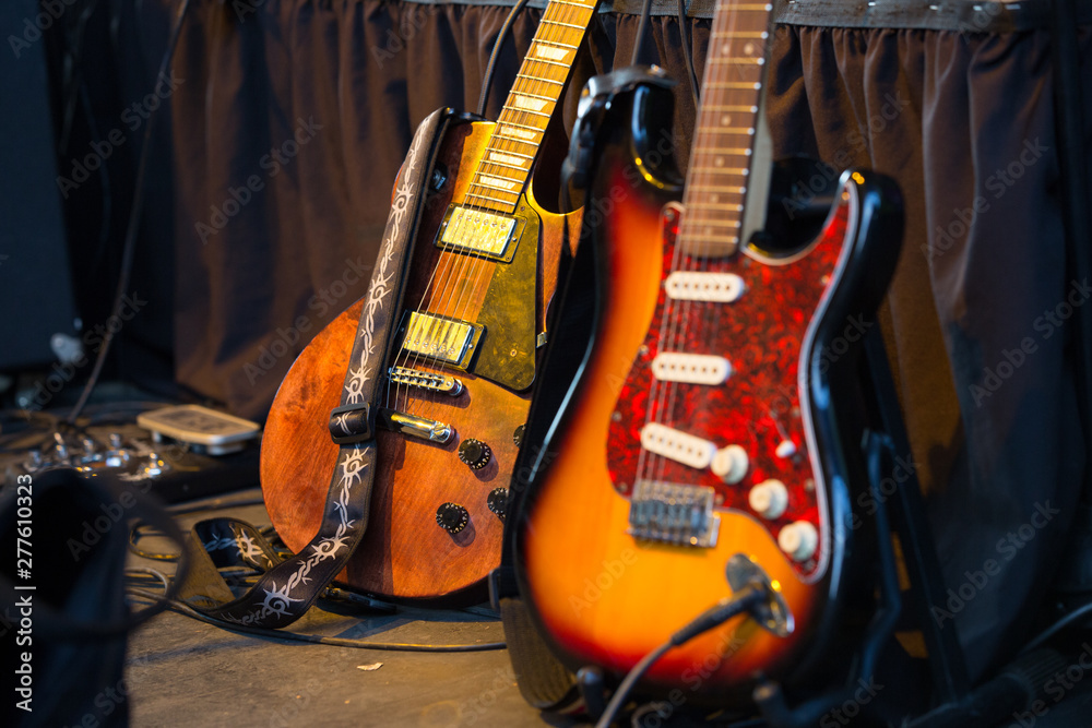 Fototapeta Two classic electric guitars ready to be played in a music studio