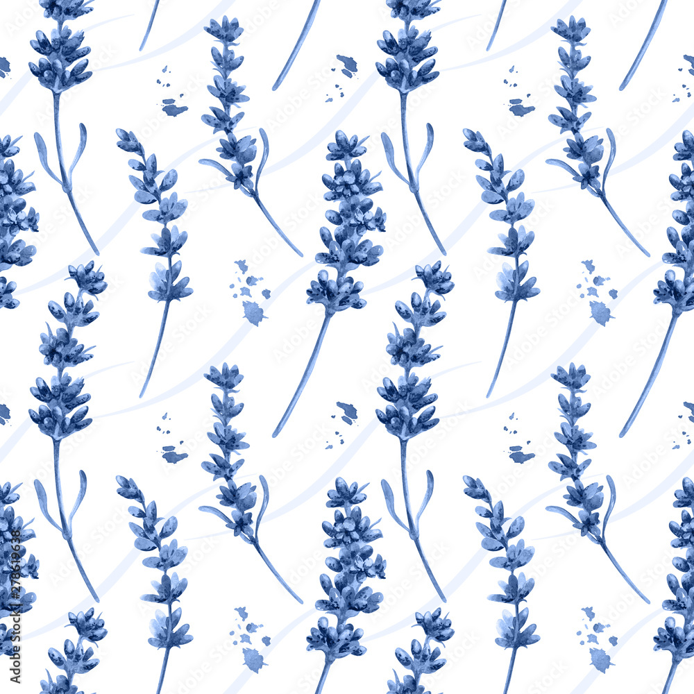 Fototapeta Watercolor seamless pattern in retro style with blue lavender flowers and leaves