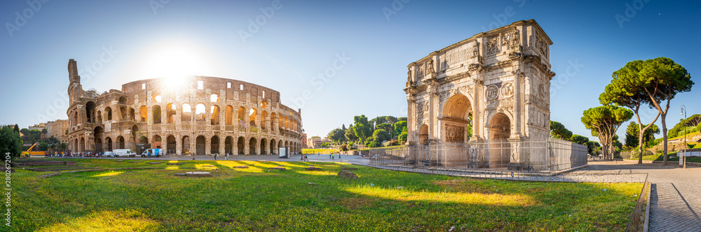 Fototapeta Panorama of Colosseum and Constantine arch at sunrise in Rome, Italy,Europe