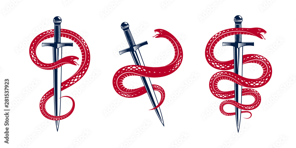 Fototapeta Snake and Dagger, Serpent wraps around a sword vector vintage tattoo, Life is a Fight concept, allegorical logo or emblem of ancient symbol