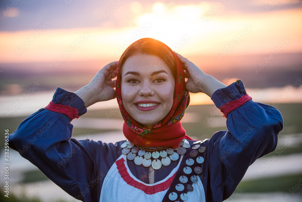 Fototapeta Young smiling woman in traditional russian clothes on a background of the sunset