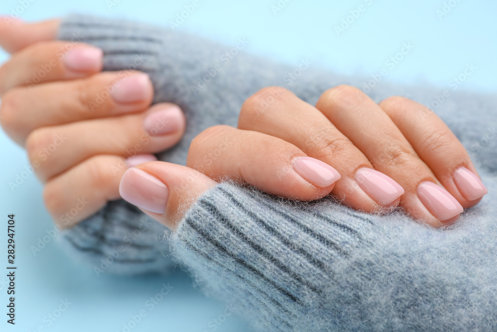 Fototapeta Hands of woman with beautiful manicure on color background, closeup