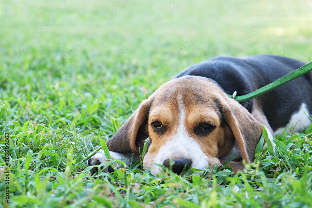 Fototapeta Portrait of funny young beagle puppy on the walk in the park, resting on juicy green mowed lawn