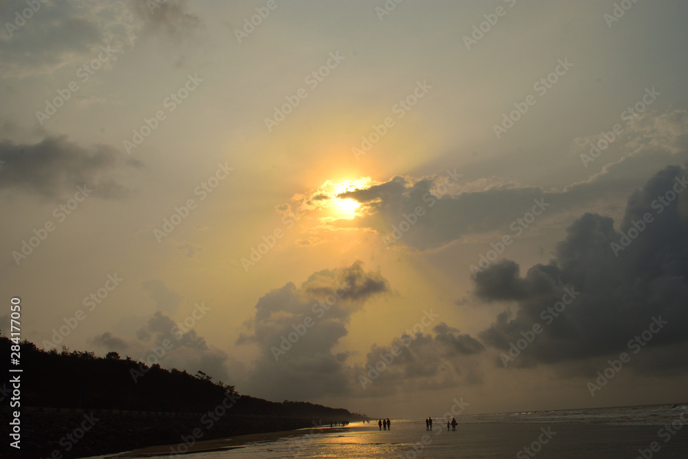 Fototapeta Scenic beach sunrise with moody vibrant sky