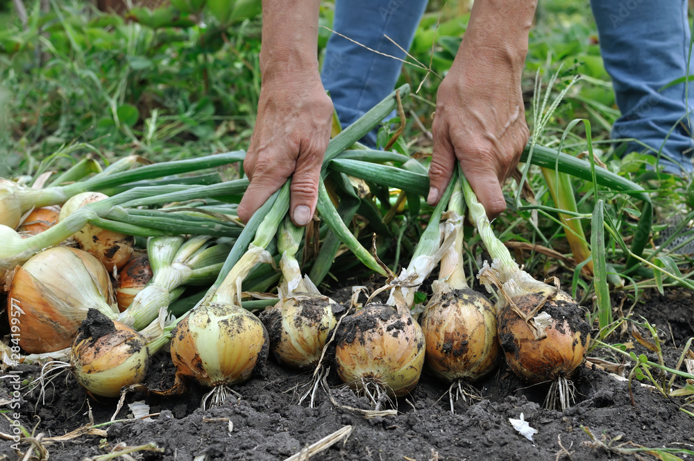 Fototapeta gardener's hands harvesting ripe organic onion in the vegetable garden