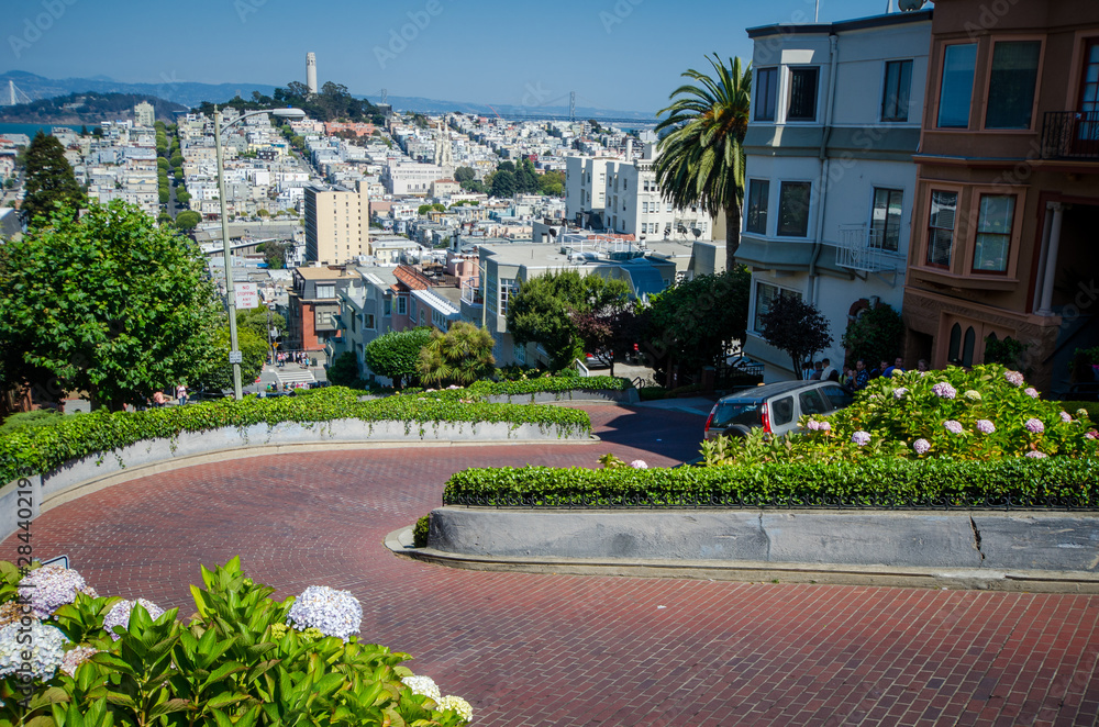 Fototapeta View from the top of Lombard Street, the crookedest street in San Francisco