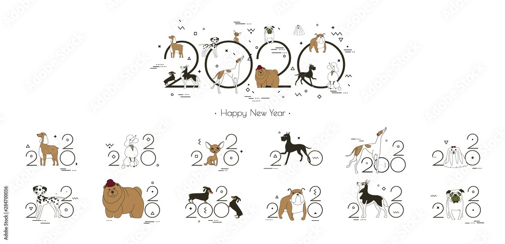 Fototapeta 2020 dog calendar, Creative headline and 12 logos with different breeds of dogs