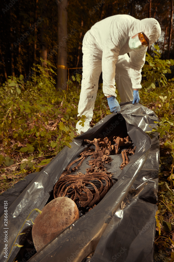 Fototapeta Collecting of human remains to plastic body bag by police technician for observi