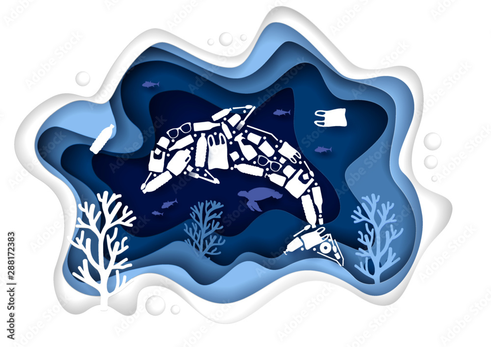 Fototapeta Stop ocean plastic pollution, vector paper cut illustration