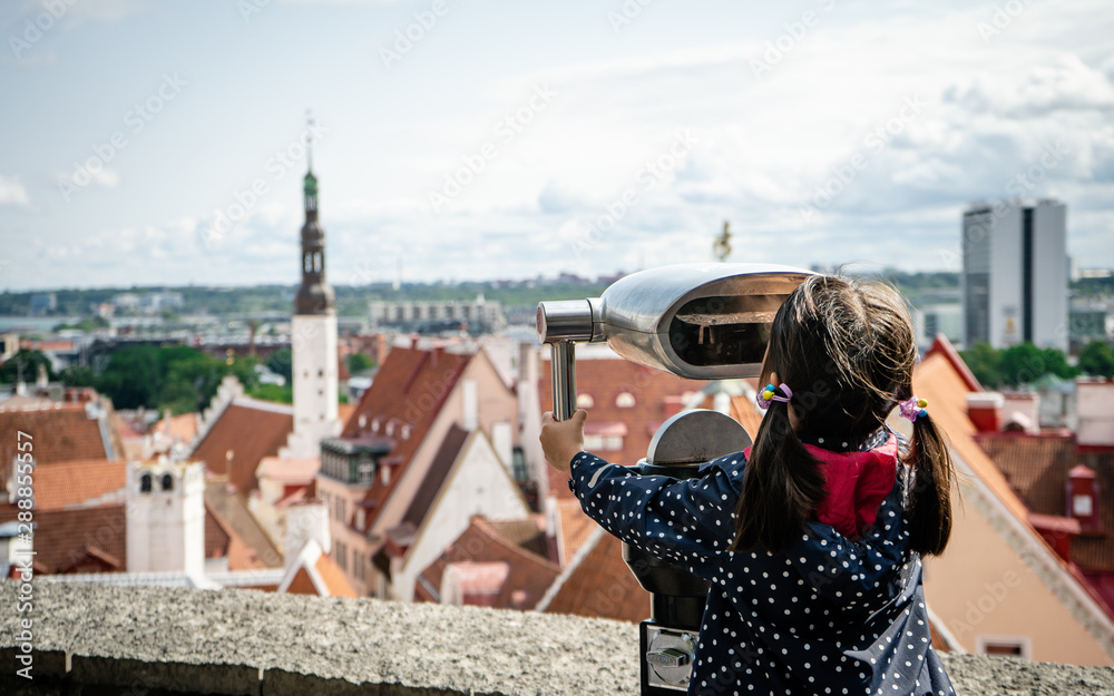 Fototapeta Little girl child looks in binoculars of the medieval streets and rooftops of lower old town Tallinn, Estonia from upper town Toompea Hill on beautiful summer day