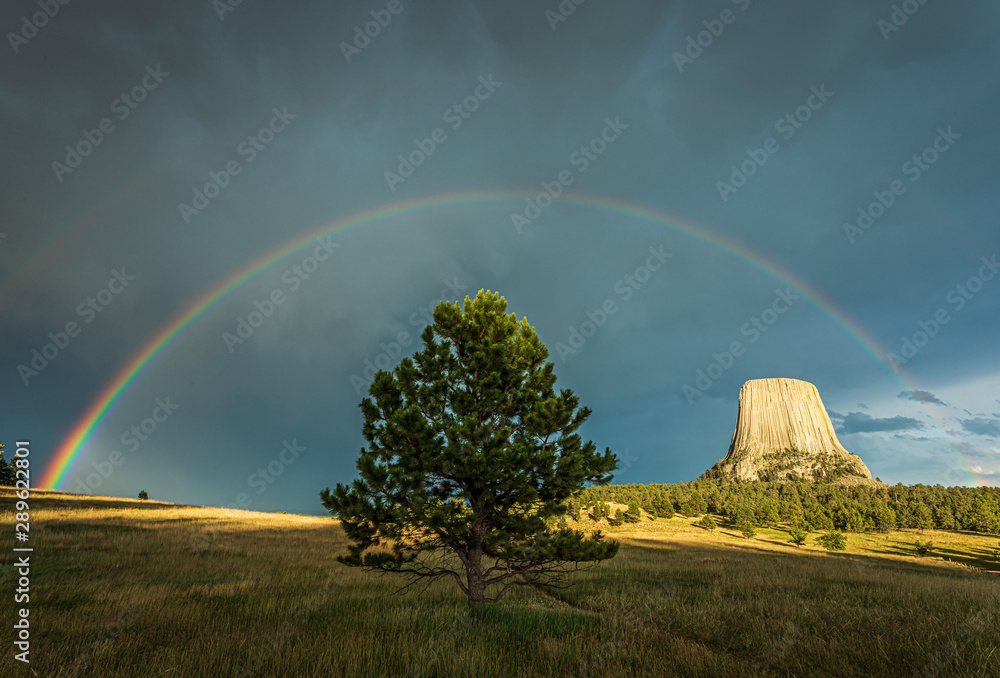 Fototapeta Solo tree and Devils Tower National Monument of Wyoming, USA under the rainbow a