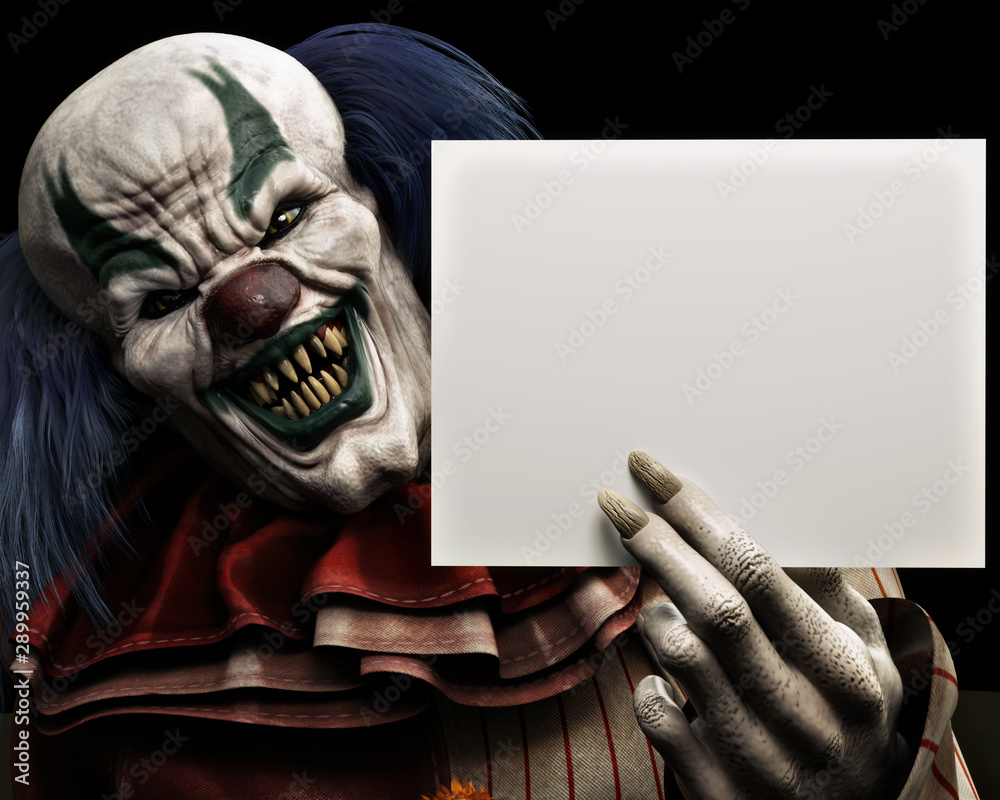Fototapeta Frightening scary clown with sharp fangs piercing the darkness holding a black advertisment card with room for your text or copy space