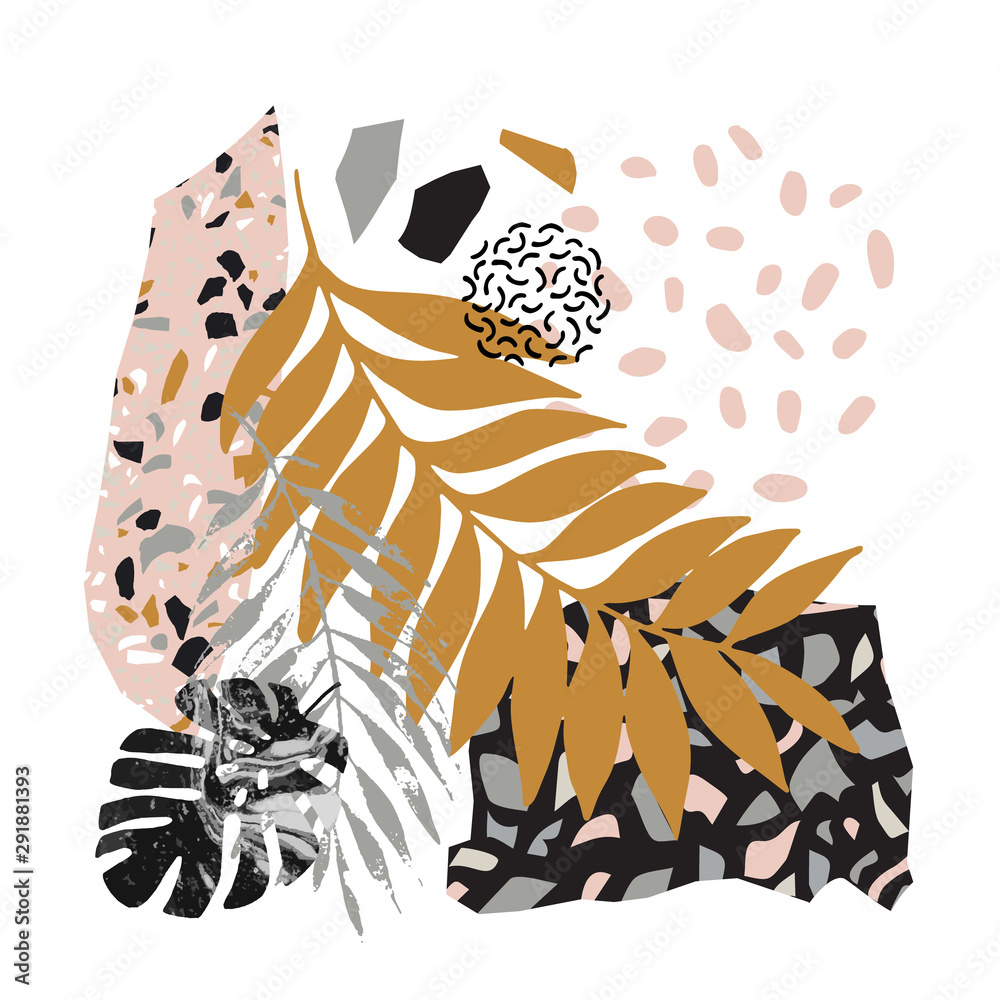 Fototapeta Modern vector illustration with tropical leaves, grunge, marbling, terrazzo flooring textures, doodles, minimal elements