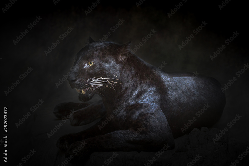 Fototapeta Panther or leopard resting in an atmosphere of wild nature.