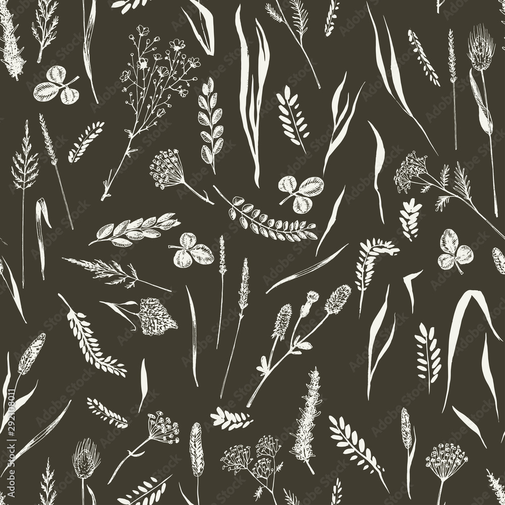 Fototapeta Wild herbs and flowers painted are in engraving style.