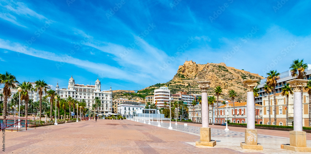 Fototapeta Houses on the promenade of Alicante, Spain in the Baroque style among palm trees