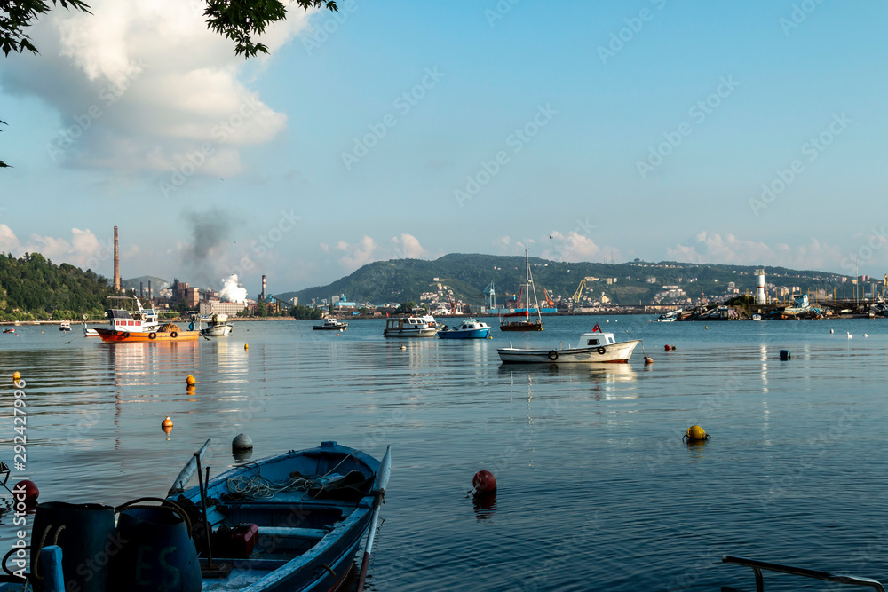 Fototapeta Zonguldak eregli district, fishing boats and erdemir iron and steel factory behi