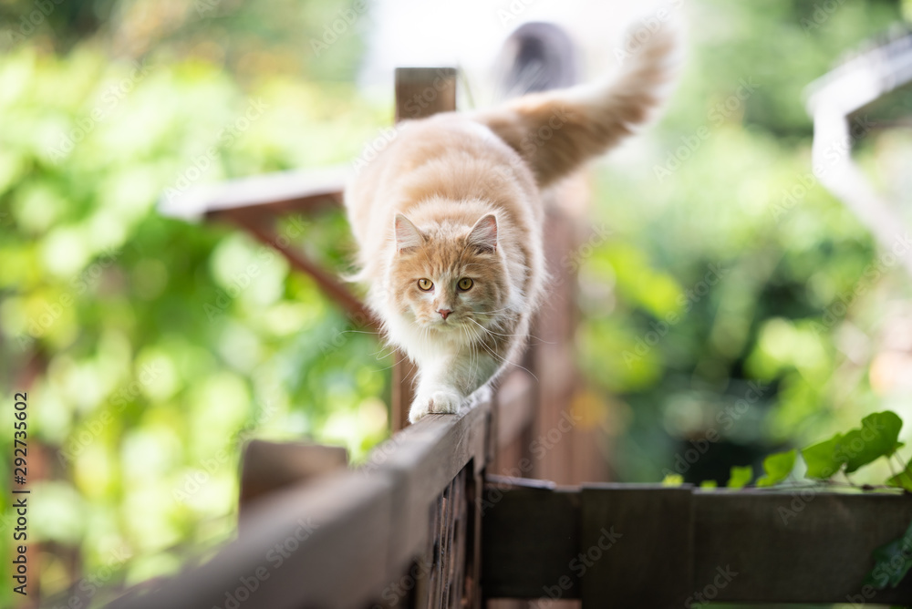 Fototapeta young cream tabby ginger maine coon cat balancing on wooden fence walking lookin