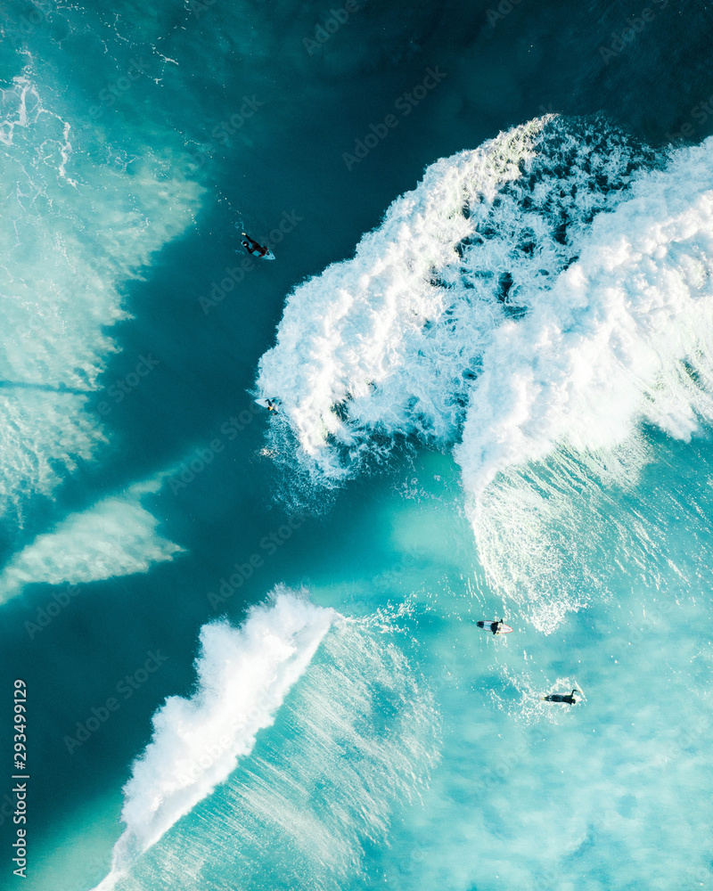 Fototapeta Surfers enjoying massive waves at sunrise in the ocean