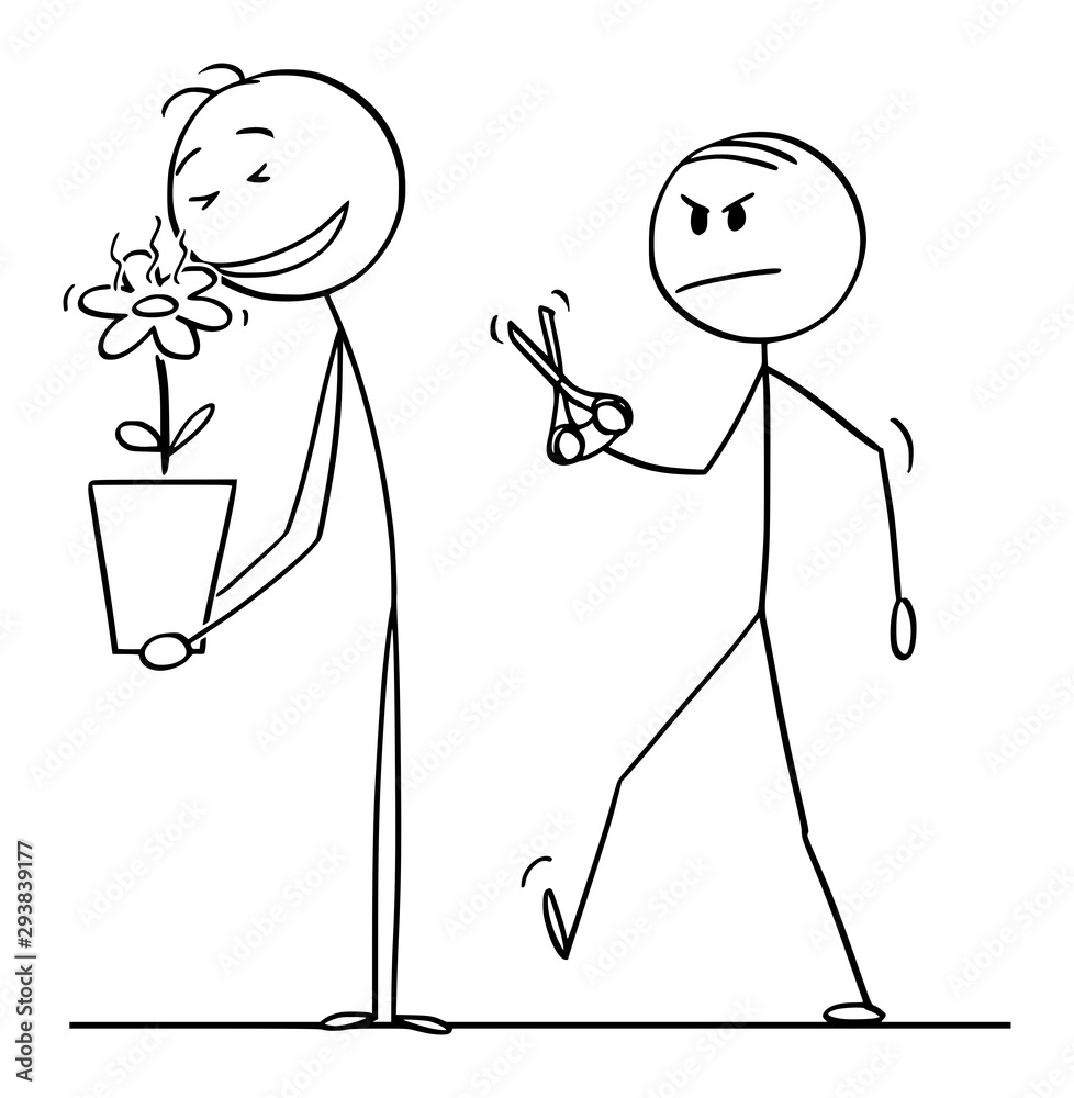 Fototapeta Vector cartoon stick figure drawing conceptual illustration of man enjoying smelling to beautiful flower in plant pot, envious colleague is going with scissors