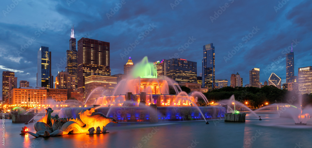 Fototapeta Panoramic view of Chicago City at night with skyscrapers and Buckingham fountain, Chicago, Illinois, USA