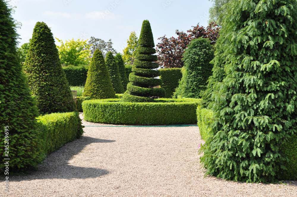 Fototapeta Topiary hedges and spiral tree in formal English garden