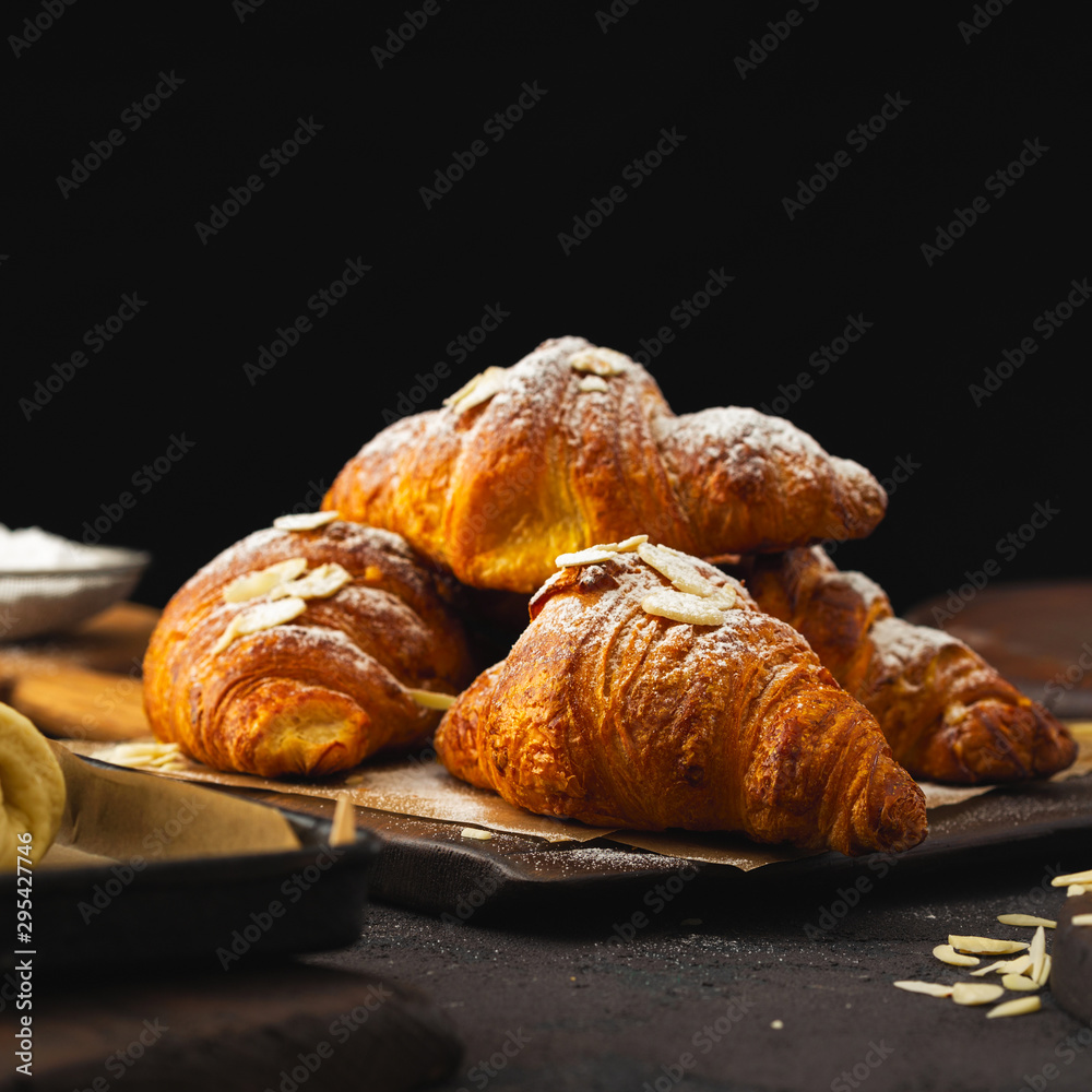 Fototapeta Breakfast croissant with chocolate on a dark stone background