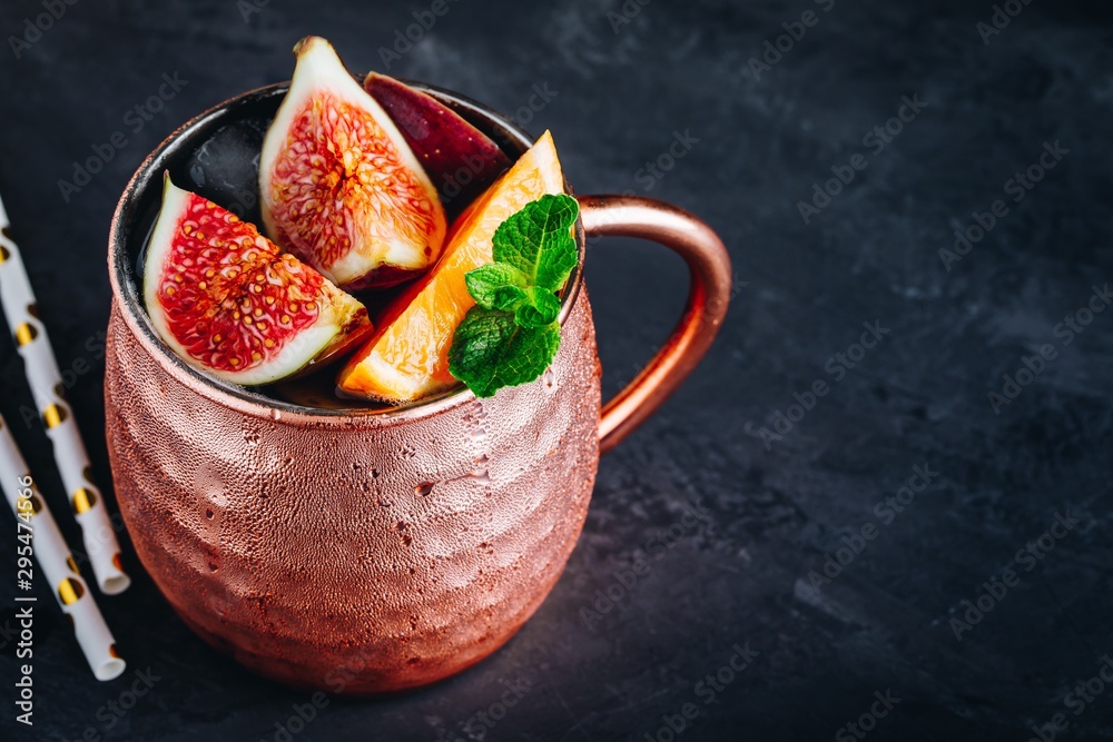 Fototapeta Fig moscow mule ice cold cocktail in copper cup with oranges and mint