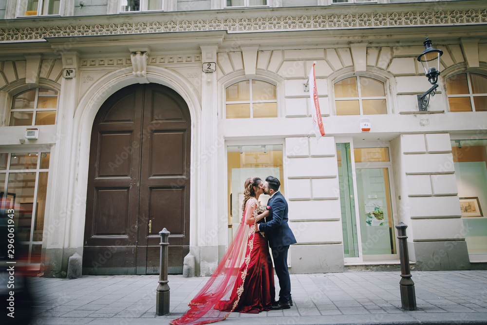 Fototapeta Beautiful woman in a long red dress walks around the city with her husband in a