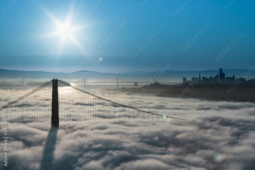 Fototapeta Aerial view of Golden Gate Bridge with Low Fog at Sunrise