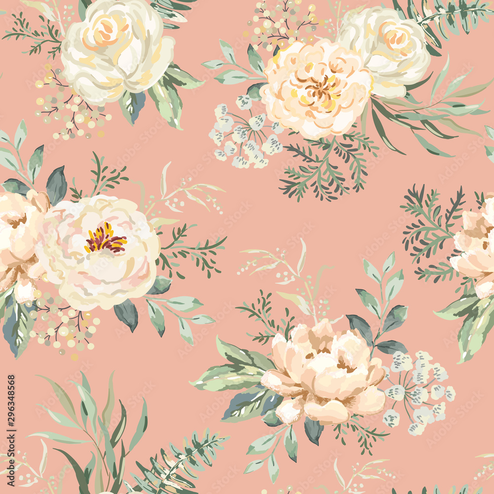 Rose, peony flowers with green leaves bouquets, pink background. Floral illustration. Vector seamless pattern. Botanical design. Nature summer plants. Romantic wedding