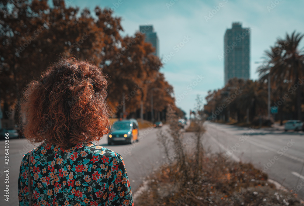 Fototapeta Tourist travels in Europe, sightseeing tour, woman looking at the twin towers in Barcelona, seen from behind