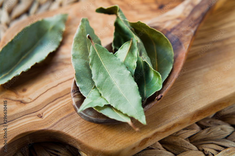 Fototapeta Dry Bay Leaves - aromatic Indian spices on wooden spoon, macro.