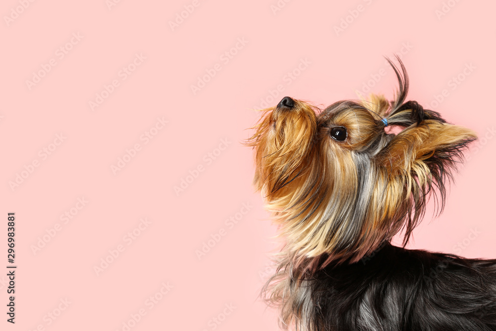 Fototapeta Adorable Yorkshire terrier on pink background, space for text