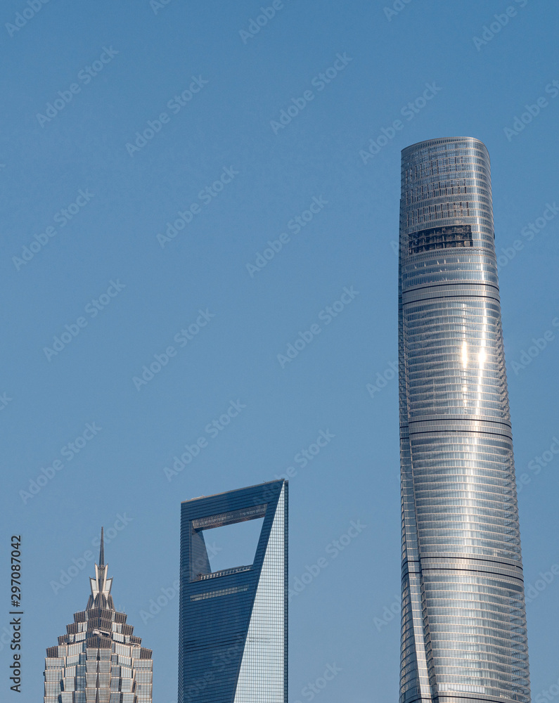 Fototapeta close up image of modern skyscrapers in Shanghai Lujiazui, Shanghai tower, jin mao tower and shanghai world financial center, landmarks with blue sky background