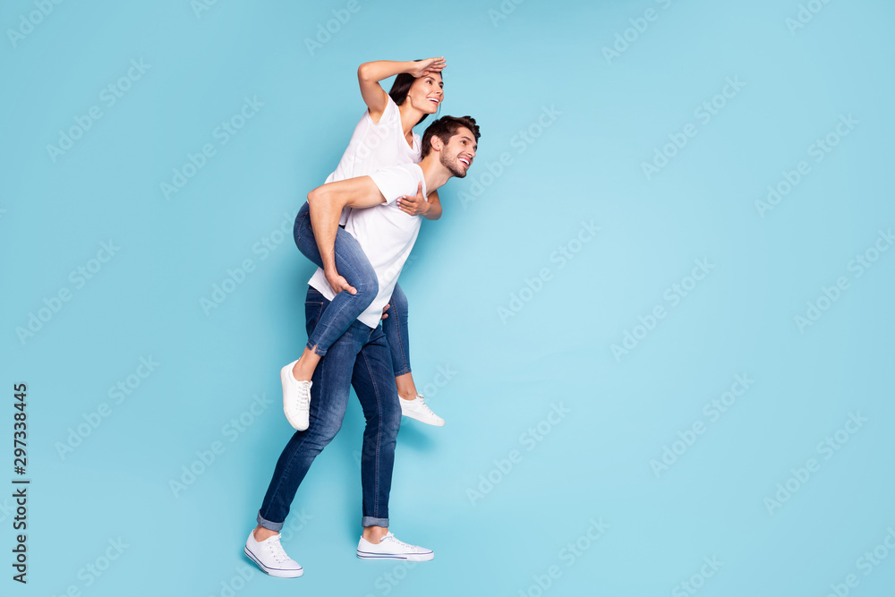 Fototapeta Full length body size profile side view of nice attractive cheerful dreamy coupl