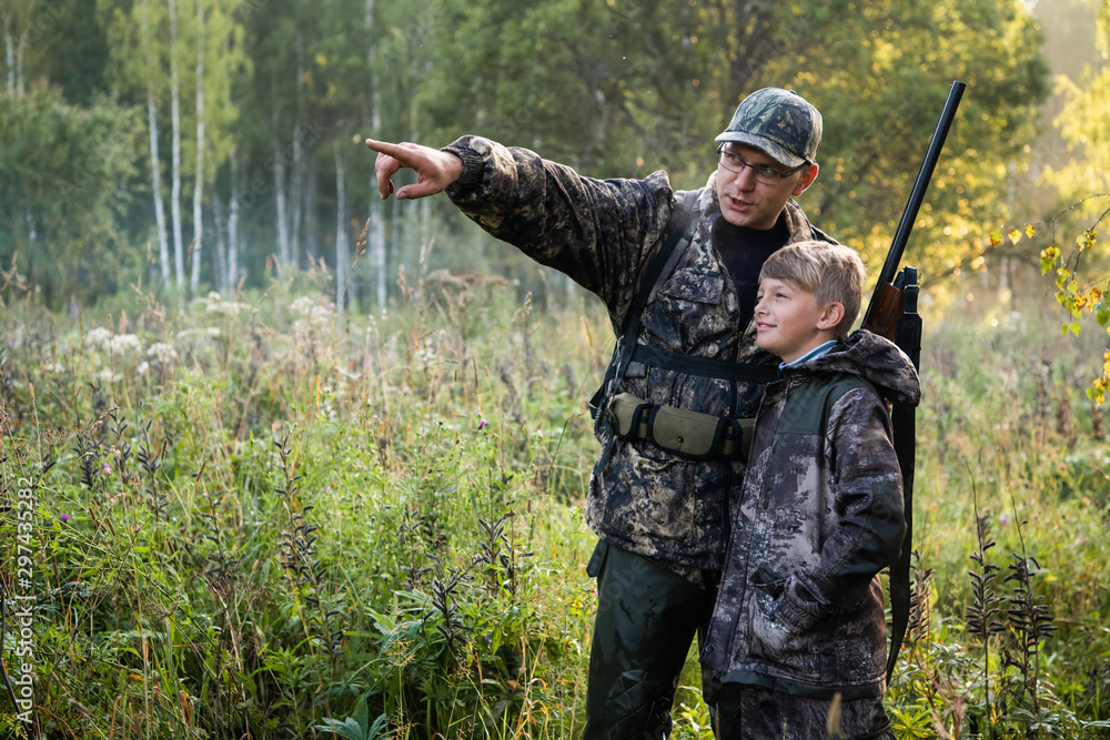 Fototapeta Father with gun showing something to son while hunting on a nature
