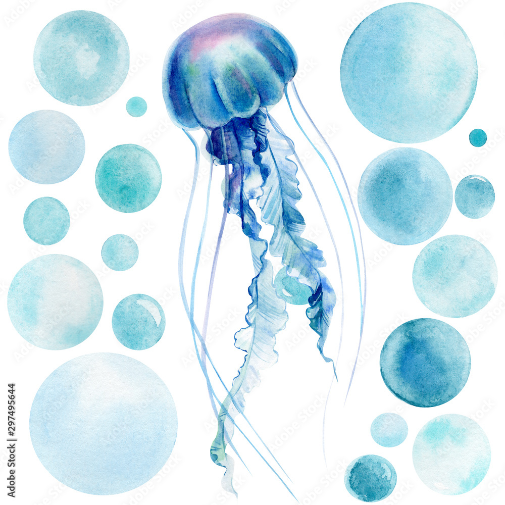 Fototapeta beautiful watercolor illustration, jellyfish and bubbles, seamless pattern
