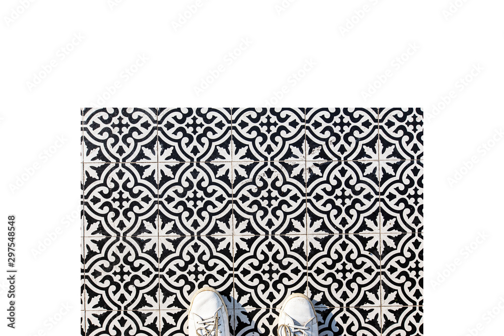 Fototapeta Top view white shoes on floral vintage pattern tiles floor.