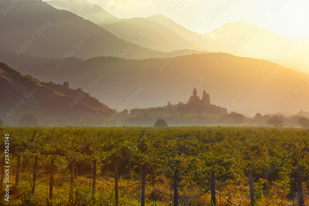 Fototapeta Scenic view of vineyards in the Kakheti region at sunrise against the background
