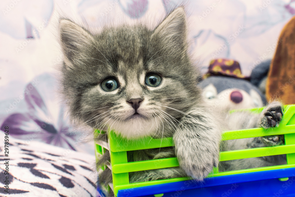 Fototapeta Gray kitten lies in the children's car, having put a paw.