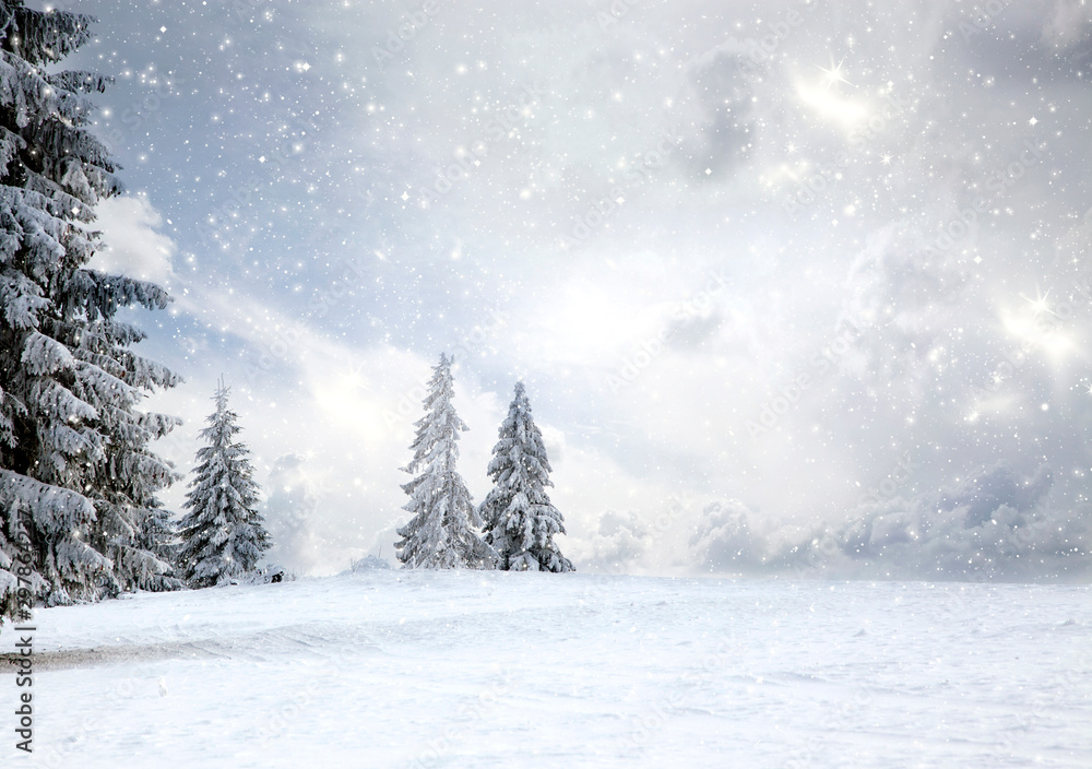Fototapeta magical Christmas card with fairy tale winter landscape with snow covered firs