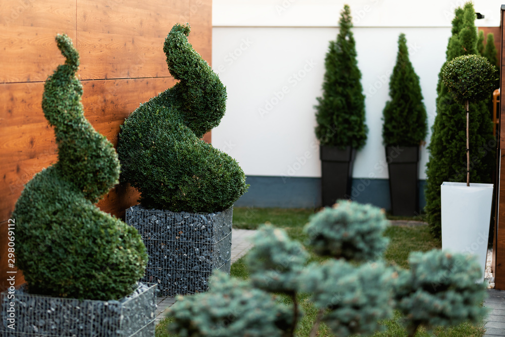 Fototapeta Decorative spiral topiary greenery in a garden.