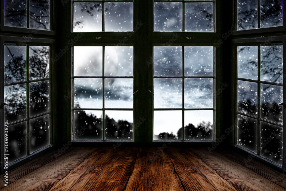 Fototapeta Table top board with big window background and beautiful snowy winter landscape outside