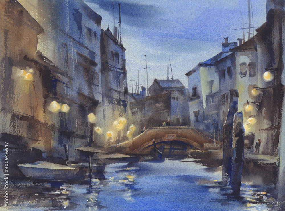 Fototapeta Venice at night watercolor landscape. Venetian nocturne