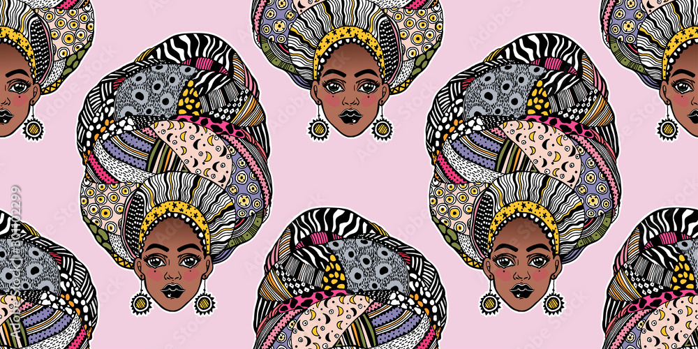Fototapeta Seamless pattern with African woman in traditional geometric turban, head wrap