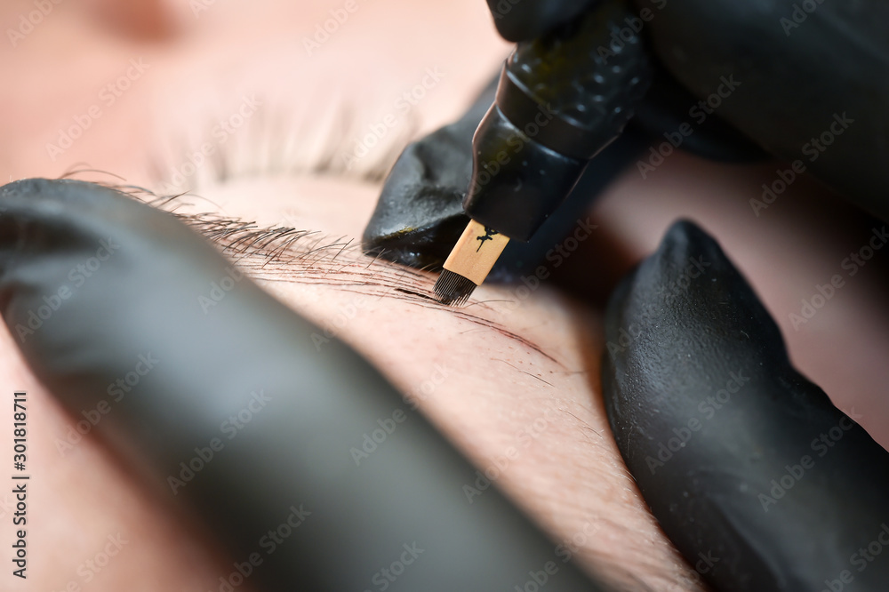 Fototapeta Microblading eyebrows, getting facial care and tattoo at beauty salon