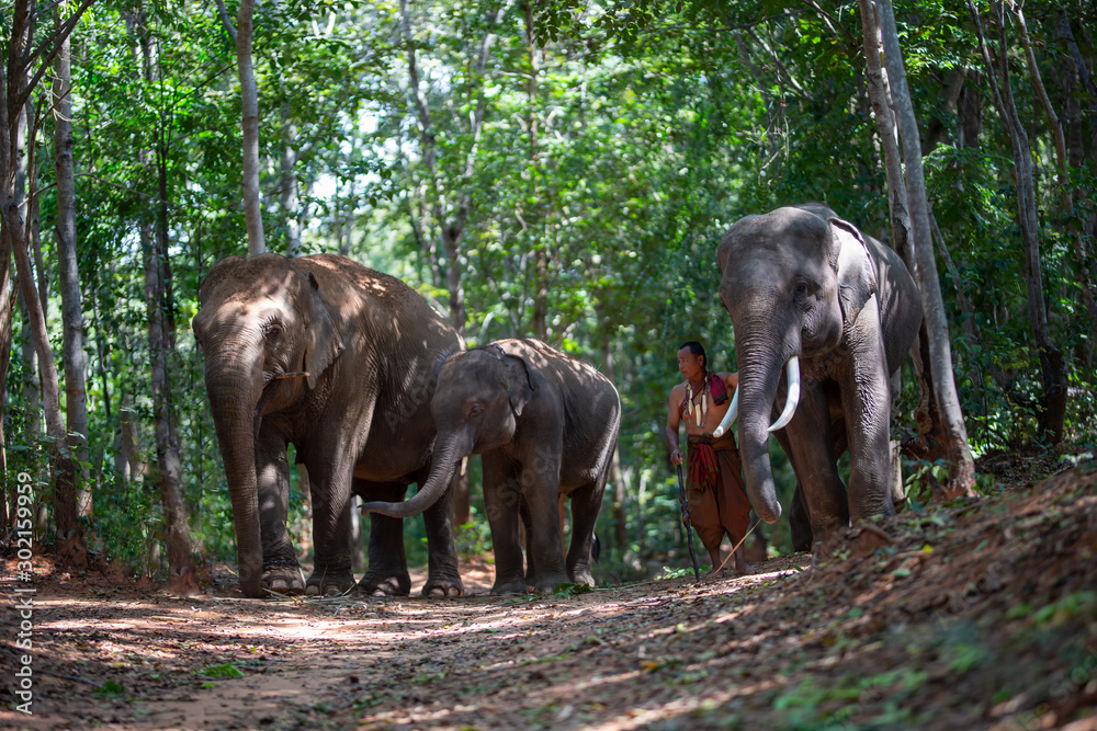 Fototapeta Shepherd in the jungle with elephantsThe elephants performed the ritual together