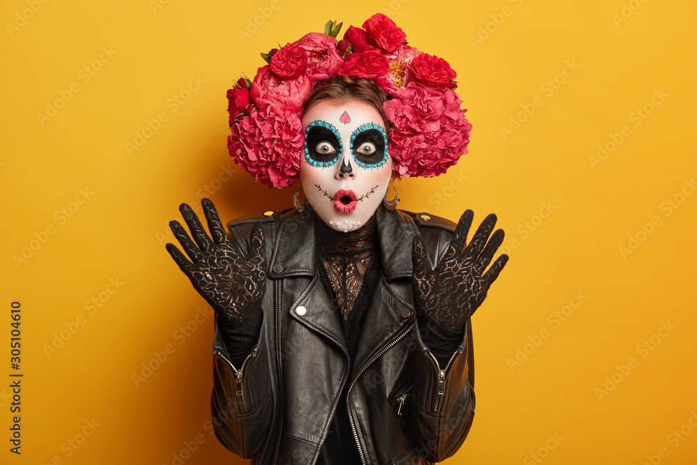 Fototapeta Embarrassed shocked woman dressed in traditional clothing or attire to honor dea