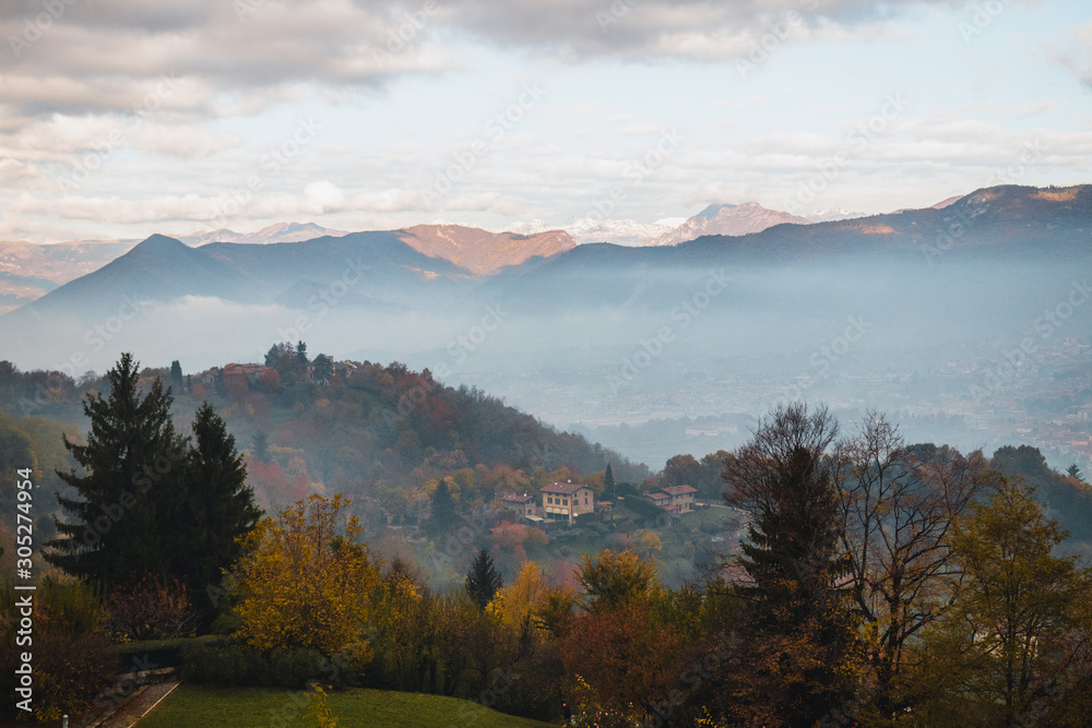 Fototapeta A thick fog enveloped the Upper city of Bergamo.